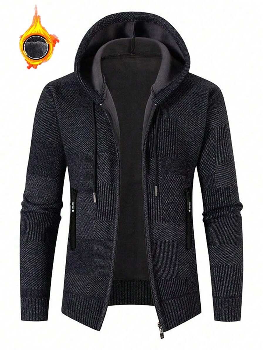 Korean Style Men's Zip-Up Thermal Lined Thick Business Casual Commute Warm Front-Zip Long Sleeve Fitted Knit Jacket With Pockets And Hood, Fall/Winter, Thermal Lined Jacket
