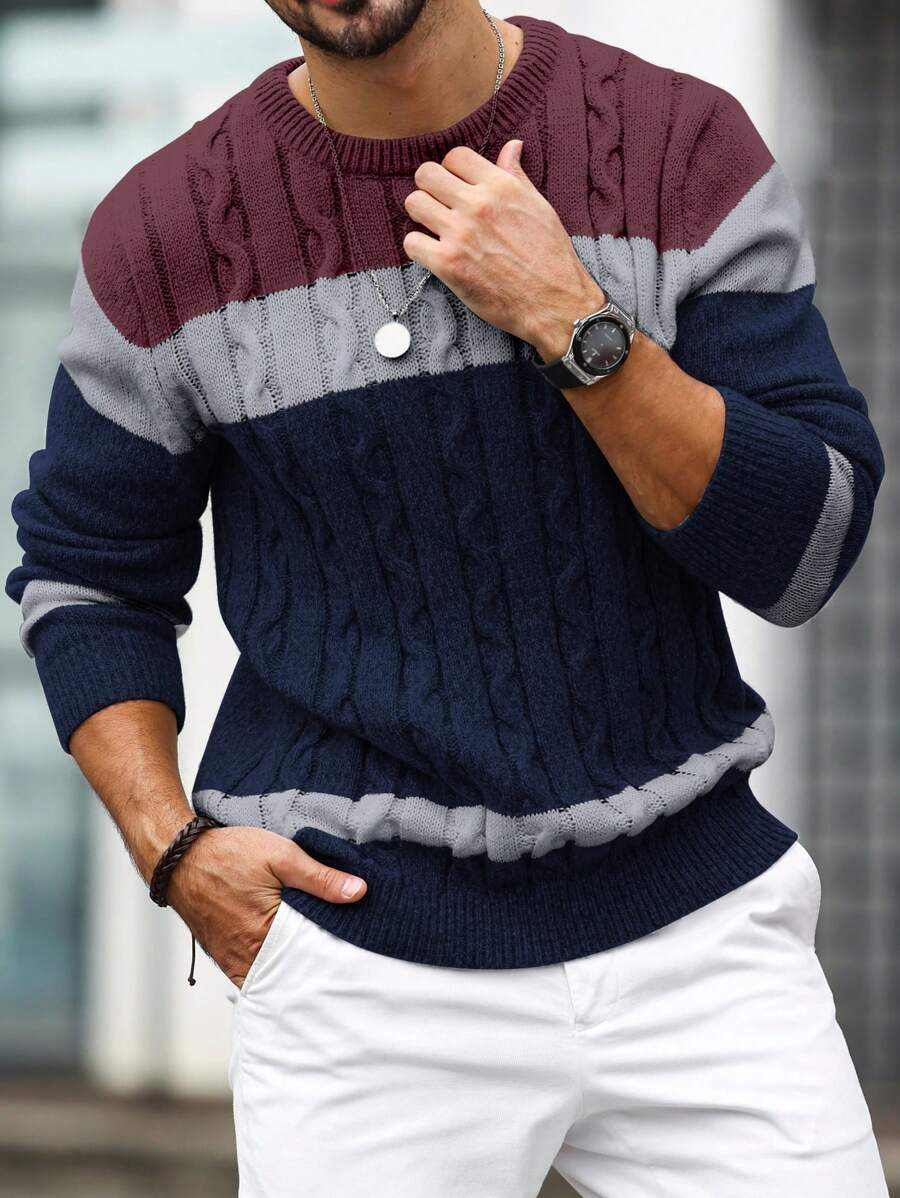 Manfinity Homme Men's Casual Crew Neck Long Sleeve Sweater With Cable Pattern And Contrast Color, Autumn/Winter Mens Jumpers
